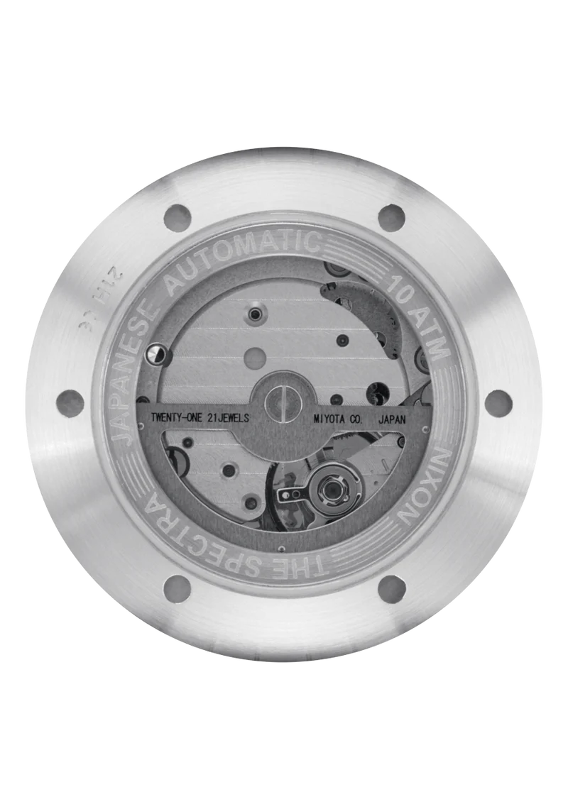 Premium Miyota 82S0 twenty-one jewel, three-hand, Japanese Automatic movement. Features a multidirectional tungsten fly wheel winding system with a 40+ hour power reserve.